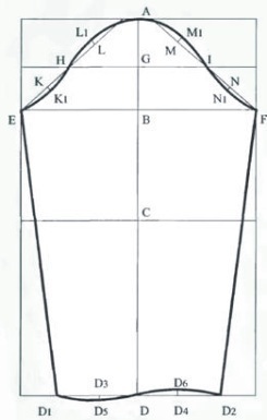 Проведем линию оката рукава по точкам Е К1 Н L1 А М1 I N1 F.